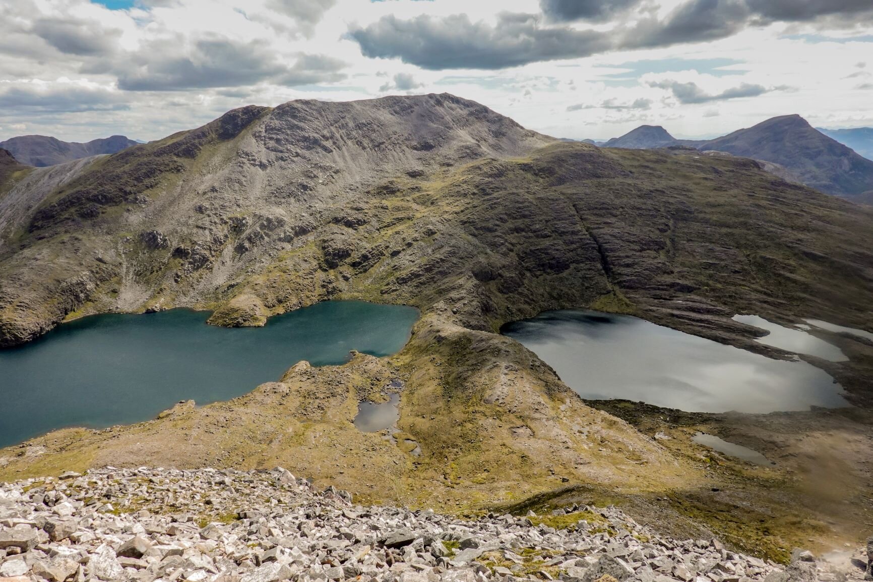It’s a slippery muddy peak-bagging slope. Not even one week in, I found myself flicking through the guidebook to work out how many Corbetts I’d climbed already, how many were left to go, how long it would take me to finish bagging them, and (slightly strangely) what age I’d be by then! Good, I guess, to know that you’ll still be alive by the time of compleating them! Already on this holiday I’d done an epic late afternoon / evening run up Beinn an Eoin and Baosbheinn, and a fabulous scramble along the ridge of Beinn Dearg, the retiring, somewhat neglected mountain in the Torridon range. I’d given up even pretending to run the ridge between Sgurr nan Lochan Uaine and Sgurr Dubh it was so rough and pathless, and the quartzite scree slopes so endless. All of this squeezed around my priority task of writing a 15,000-word fundraising application for the poetry festival which I’d taken on the Directorship of alongside my work on Scree (which at this point had started to flag rather as a result of other workloads). Next up on the schedule were Meall a’Ghiuthais and Ruadh-stac Beag, and then I’d spend a three-day backpack ticking off four or five Corbetts in Letterewe Forest…and before I knew it?